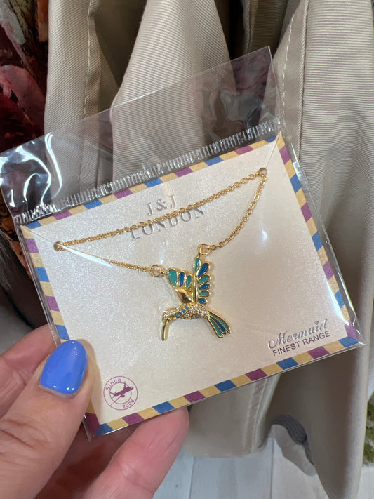Gold Plated Hummingbird Necklace with Cubic Zirconia & Turquoise Detail