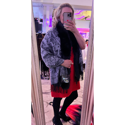 Black & Grey Paisley Wrap Black Fur Trim