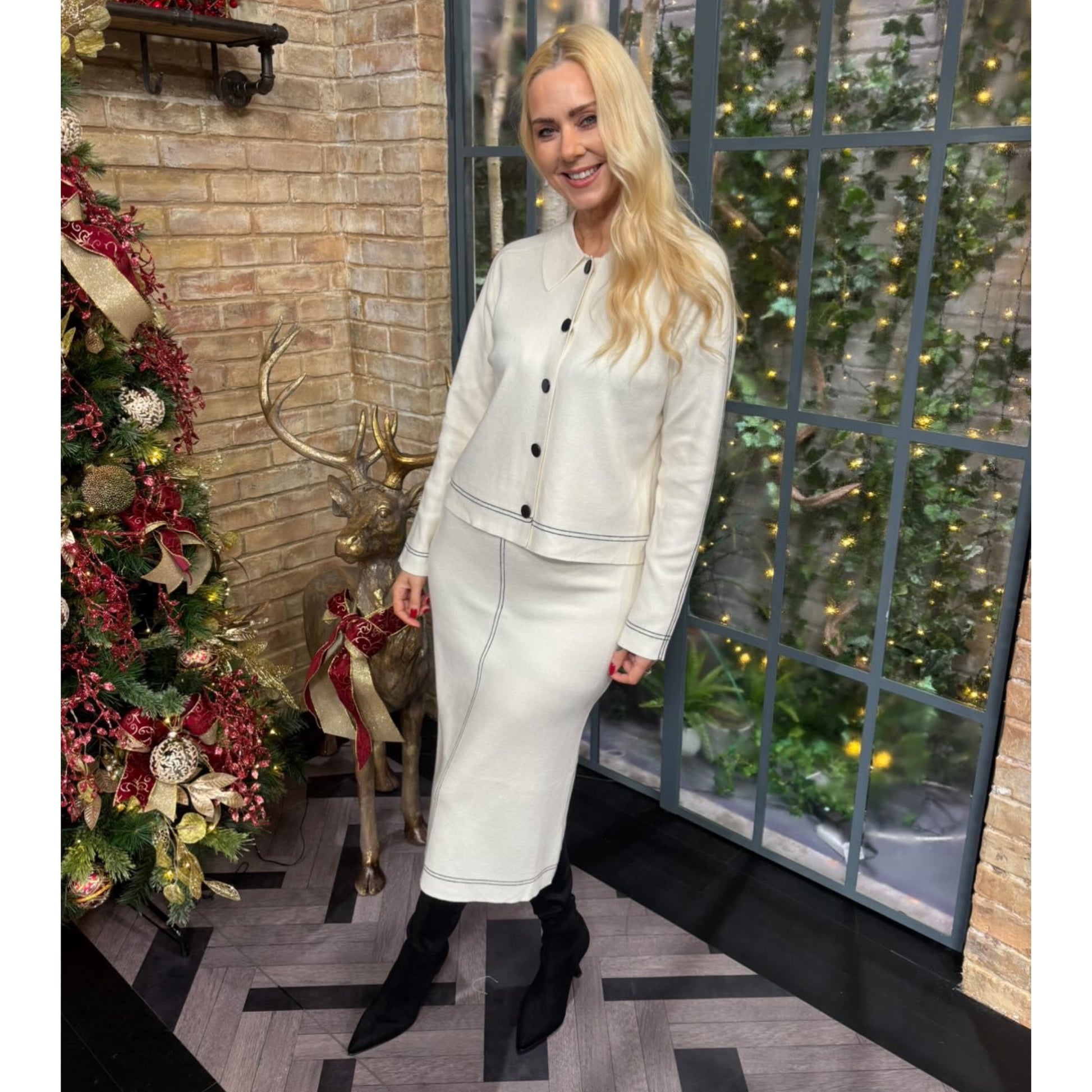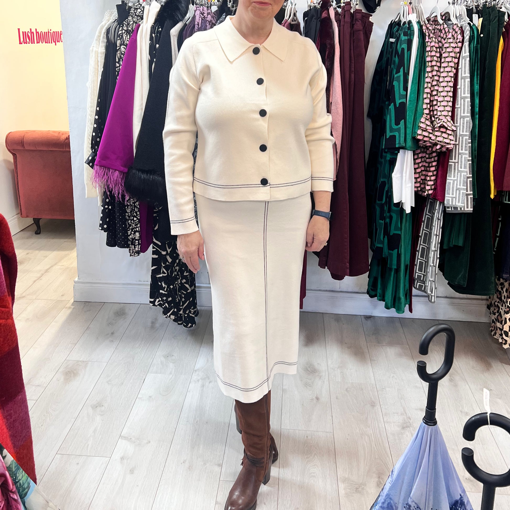 Elasticated skirt, stretch cardigan style jacket with black buttons.