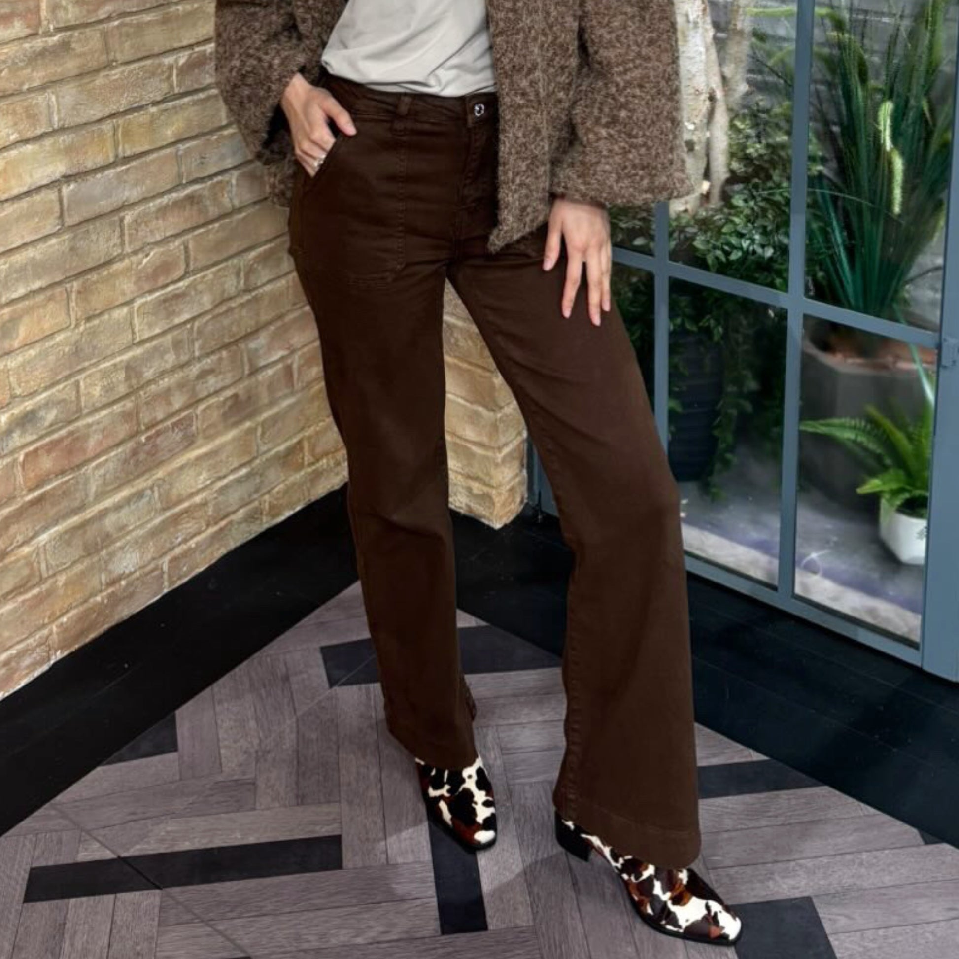 High waisted stretch cotton jeans with pockets. Very comfortable and good fitting.