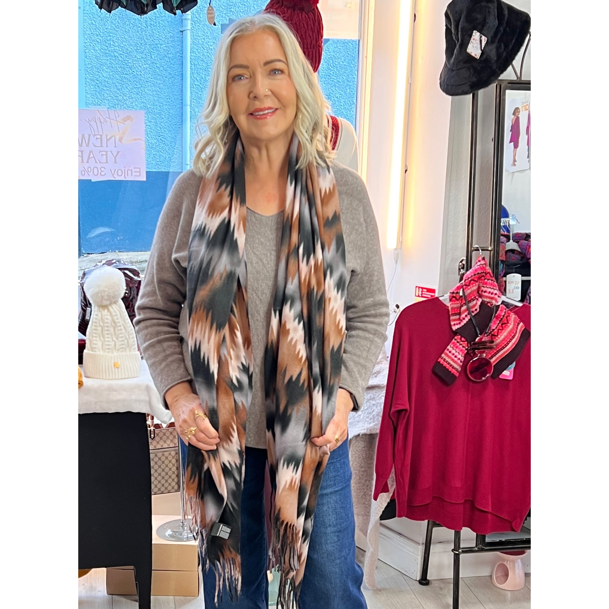 Cosy Zig Zag Scarf Brown Grey & Cream