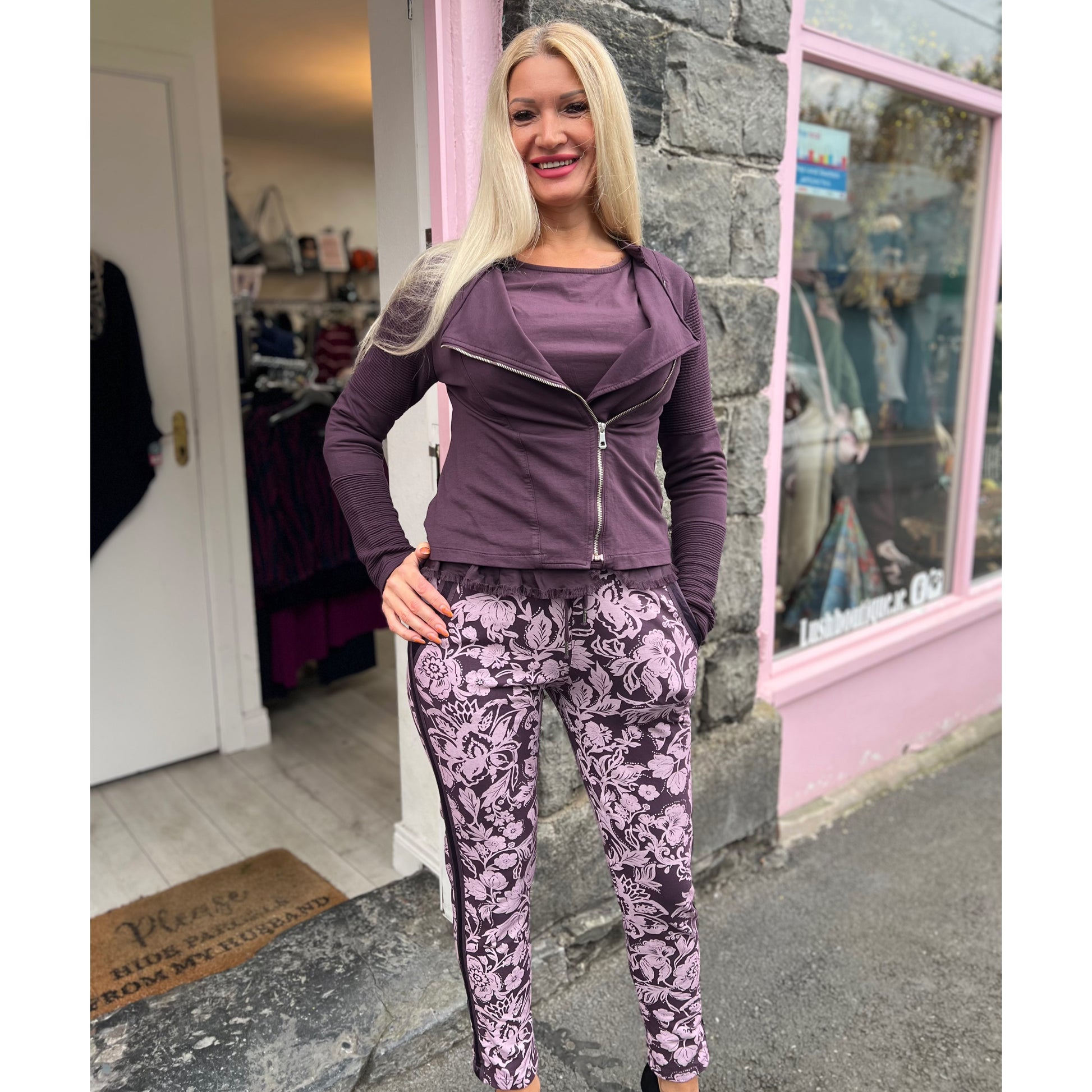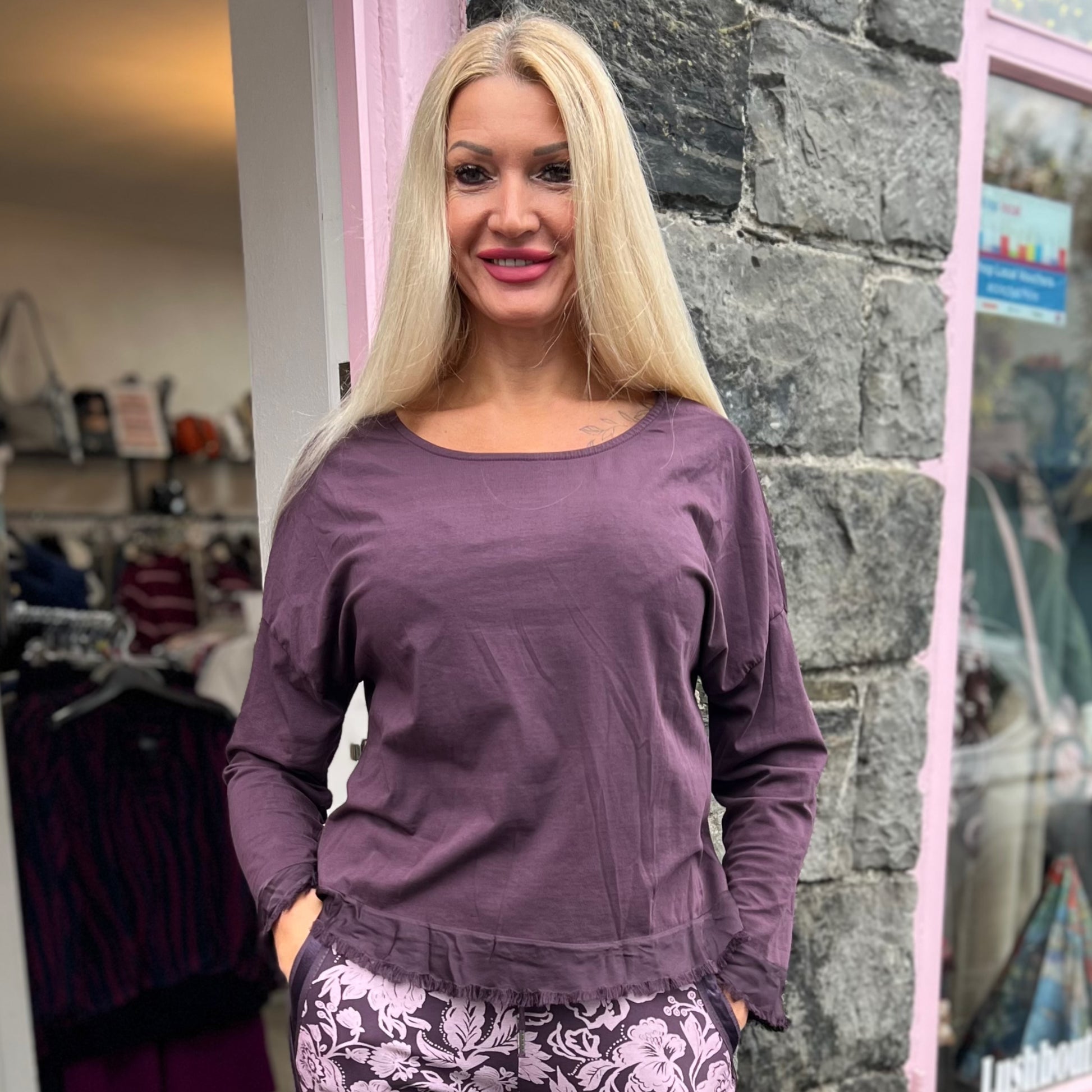 Mulberry shade. Round neck. Cotton fabric with frayed satin hem. Buttoned back functioning buttons. Full length sleeves.