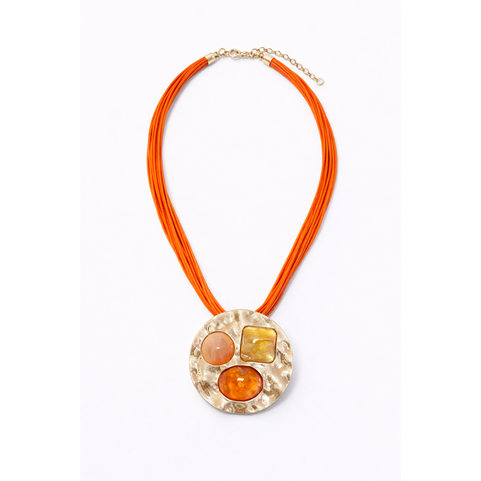 Make a bold style statement with our Vibrant Orange Sunset Glow Statement Pendant Necklace. Designed with vibrant multi-strand orange cords, this eye-catching piece is finished with a hammered gold-tone disc pendant featuring warm-toned stones in soft peach, amber, and rich orange hues.