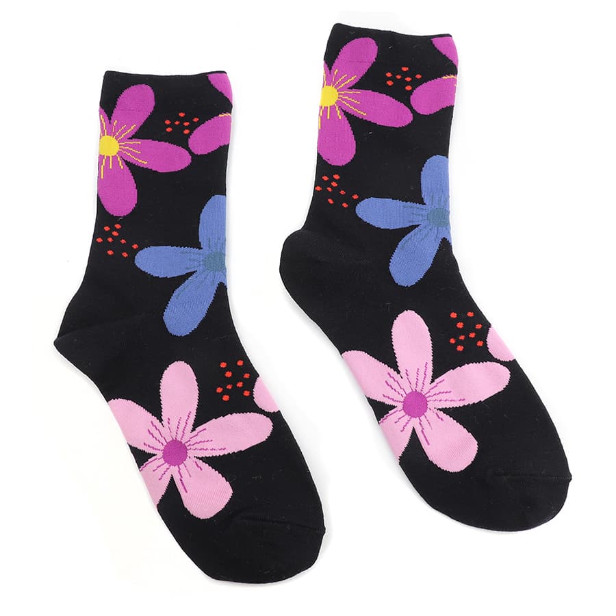 Recycled and organic blend dark navy ankle socks with bold floral and decorative dots pattern in blue, purple and pink