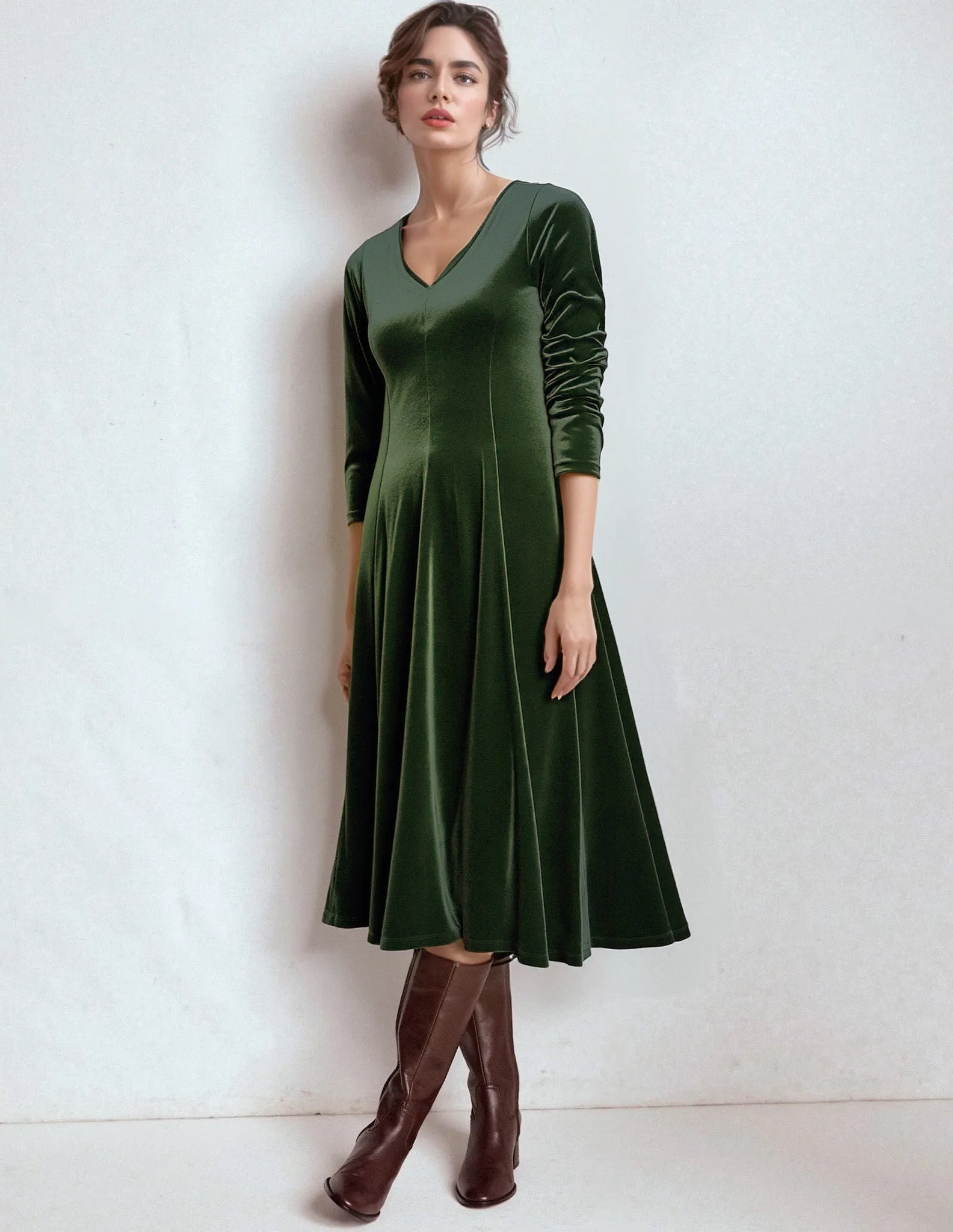 Una Green Velvet Midi Flared Dress